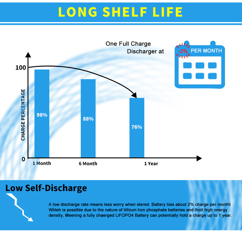 Oferim 2 anys de garantia per a tota la nostra bateria. Garantim una vida útil mínima de 2000 cicles per a la bateria LiFePO4, cosa que significa que, després del 2000 @ 80% DOD, encara quedarà al voltant del 60% de capacitat. Podeu utilitzar-la com a mínim 5 anys per a una càrrega i descàrrega normals 1 vegada cada dia.
