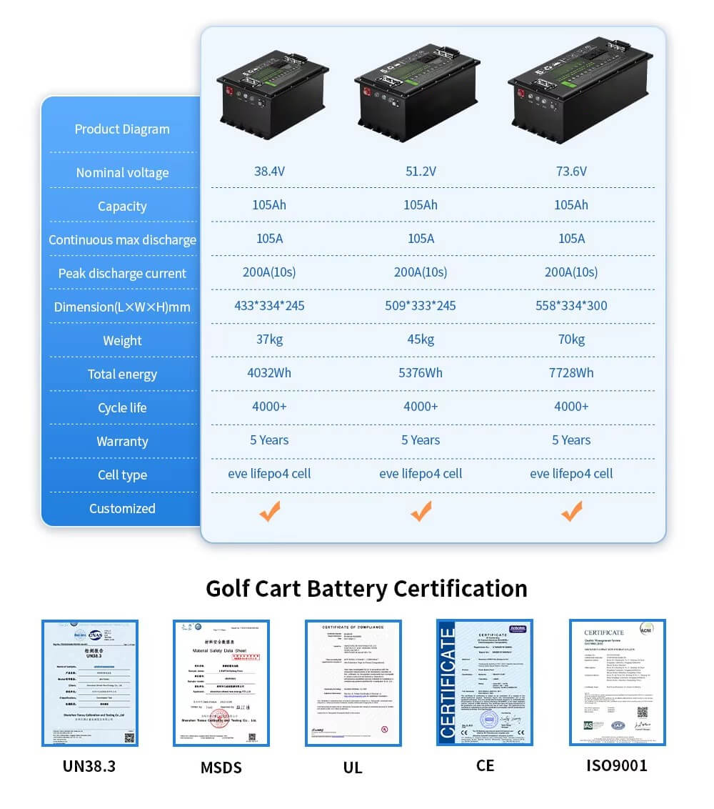 | Aplicació | Golf cart 【We also provide power batteries for forklifts, industrial vehicles (VGA), ATV, UTV and so on.】 | |||