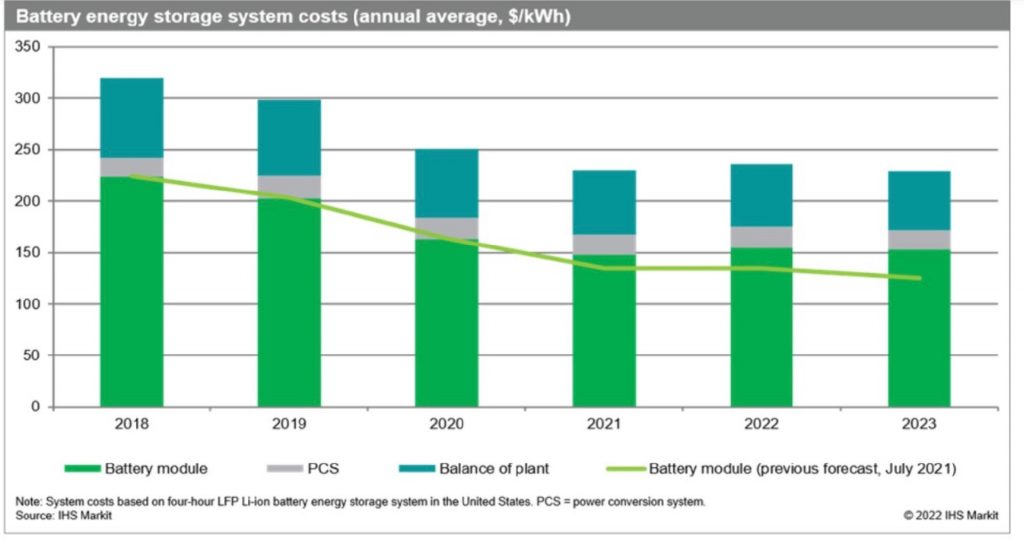En un llibre blanc recent, IHS Markit va predir que l'augment dels preus de les matèries primeres posaria en suspens la baixada dels preus de les bateries dels vehicles elèctrics fins al 2024. Aquesta anàlisi va predir que els preus mitjans de les bateries dels vehicles elèctrics del 2022 seran un 5% més alts que el 2021, principalment a causa de l'augment de les automàtiques. demanda de la indústria de bateries de fosfat de ferro de liti (LFP).